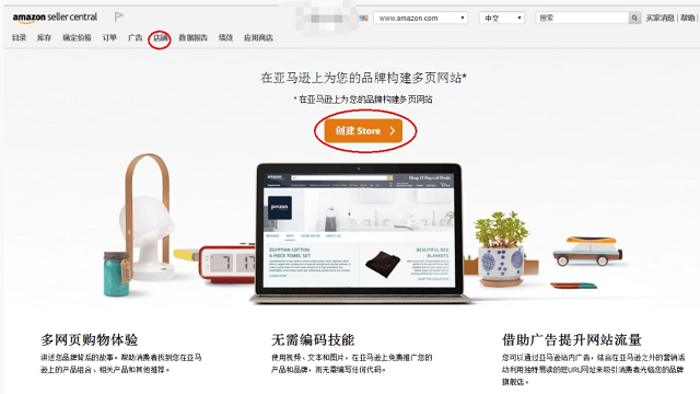 第1步:登陸亞馬遜后臺(tái),點(diǎn)擊“店鋪”,選擇“創(chuàng)建Store”;