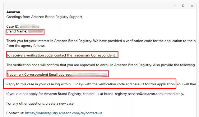 第8步:提交之后,亞馬遜會(huì)發(fā)一封品牌備案的郵件,需要在30天內(nèi)回復(fù)驗(yàn)證碼(如果你的商標(biāo)是找服務(wù)商注冊(cè)的,就直接找注冊(cè)的服務(wù)商索取);
