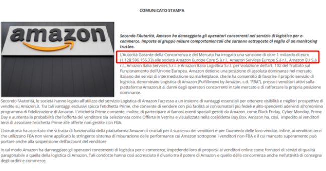 在意大利當?shù)貢r間12.09日,意大利的官方機構(gòu)發(fā)布了對亞馬遜機構(gòu)的制裁,最主要的原因,意大利的反壟斷機構(gòu)通過跟蹤調(diào)查亞馬旗下的公司,認定亞馬遜互聯(lián)網(wǎng)平臺有意的引導(dǎo)商家用本公司旗下的物流公司,然后會給用自己旗下物流公司的商家其他的優(yōu)惠,比如將優(yōu)先使用亞馬遜自營物流的商家的商品排名靠前,放在易搜索的位置,從而引導(dǎo)更多的消費者購買亞馬遜自營物流商品。