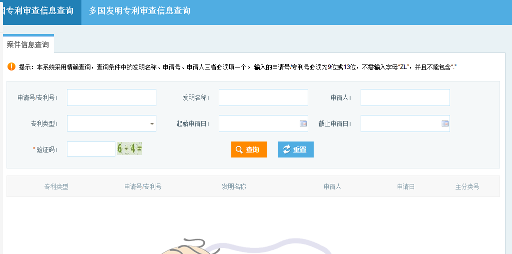 第三步,直接輸入專利申請?zhí)?,注意不要輸入倒?shù)第二位的小數(shù)點,再輸入“驗證碼”,也就是右側(cè)顯示的數(shù)學(xué)計算的結(jié)果,點擊“查詢”,即可顯示結(jié)果。