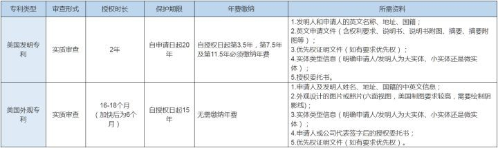 美國(guó)專利審查形式、授權(quán)時(shí)長(zhǎng)、保護(hù)期限及申請(qǐng)所需資料等詳見下表: